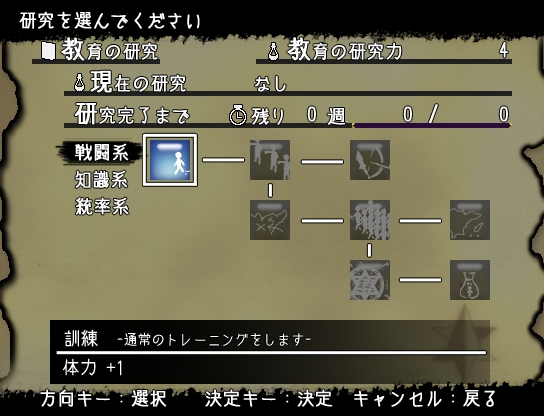 教育メニューは「研究」によって増やすことができ、この「研究」の速度は書物の購入によって上げられる。