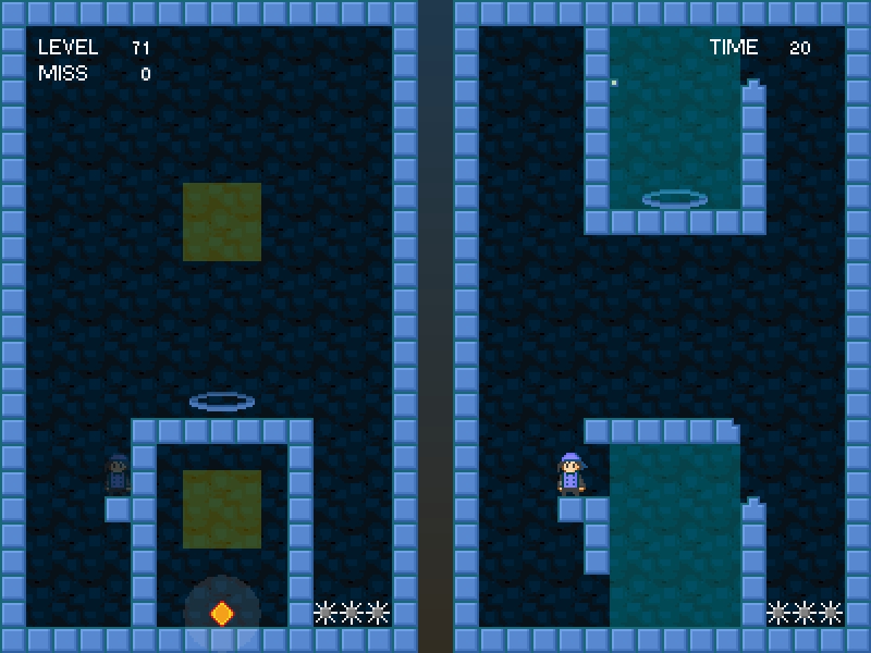 テレポートボタンでキャラクターを左右の画面に移動させ、その移動先は半透明のキャラクターで示される。
