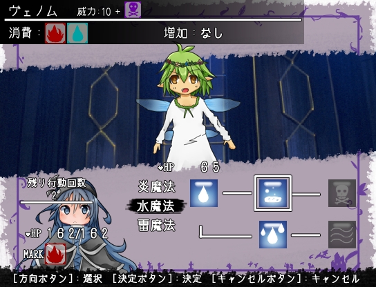 炎魔法を使えば「炎」のマークが増え、水魔法(回復)を使えば「水」が増える。